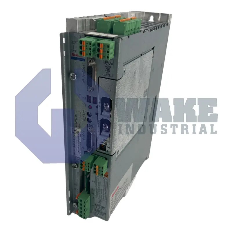It supports the following encoder types, depending on the type of motor connected: for the first encoder port ‘x4’, it can accept a single-turn or multi-turn DSF/HSF encoder, a resolver with or without FDS (feedback data storage); for its second port ‘x8’, it can accept a sine encoder, EnDat absolute encoder, gear-type encoder with 1Vss signals, and a square-wave encoder with 5V TTL signals. With the right combination of these encoders, a high level of precision can be achieved with the servo-motor control. For electrical connection, this servo-drive can be powered via a single source, group source without DC bus connection, or a central supply. For any of the sources, the mains is meant to be configured for either a single-phase or 3-phase AC supply. This product is available from Wake Industrial with a one-year warranty period.