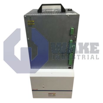 Peak power output for the supply which can be sustained for 0.30 seconds at 380 / 400 / 440 / 480 Volts AC is 99 / 105 / 114 / 126 kilowatts. The HVE04.2-W075L supports increased loading capacity for external DC bus capacitors up to 200 millifarad. The DC bus voltage range is 530 to 670 Volts AC. Approximate weight of the HVE04.2-W075L is 28 kilograms. It is designed for installation in modular DIAX04 systems from Rexroth. A single HVE supply provides power to multiple drive controllers from HDD and HDS product lines. Cooling mode on the HVE04.2-W075L is internal with built in blower. Housing of the supply measures 498 x 250 x 262 millimeters. The supply housing has IP 10 protection rating and should be installed inside an industrial cabinet. Operation and maintenance of HVE series supplies should be performed by trained professionals.