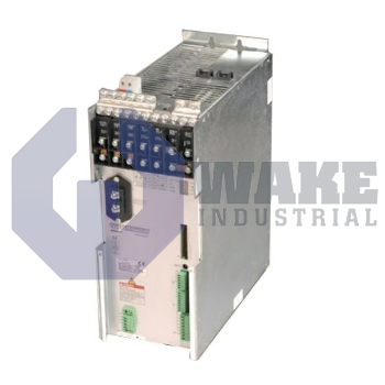 In addition to providing DC power for the drives, the TVD 1.1-15-03 also provides +24 Volts / ±15 Volts power for the drive electronics modules. When a power failure occurs, these voltages for the drive electronics are supplied by the DC bus circuit. A ribbon cable is provided on the TVD 1.1-15-03 which is used for communication with the connected drives. Maximum DC bus power for the TVD 1.1-15-03 is 45 kilowatts. This power output can be sustained for up to 0.3 seconds only. The bleeder peak power is 40 kilowatts and the bleeder continuous power rating is 1 kilowatt. During operation with maximum output power, the TVD 1.1-15-03 dissipates 330 Watts. Approximate weight of the power resupply module is 11 kilograms. All installation and maintenance related activities for the supply must be performed by trained personnel. This unit can be shipped globally with a one-year warranty period from Wake Industrial.