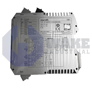 The VT-MSPA1-30-1X-V0-0 is a Bosch VT-MSPA1 series analog amplifier that is suitable for controlling direct operation proportional pressure valves. It is especially designed for control of the following valves: DBE(M) 30-3X and DRE(M) 30-4X. The VT-MSPA1-30-1X-V0-0 is the standard version of the analog amplifier. Its numerous features include inverse-polarity protection of the operating voltage, differential input, ramp generator, dither generator with fixed frequency, zero point potentiometer, characteristic curve generator, output short-circuit protection and LED display. Upper limit of the operating voltage is 35 Volts DC. The lower limit of the operating voltage is 21 Volts DC. The nominal value of the operating voltage is 24 Volts DC. The maximum power consumption of the VT-MSPA1-30-1X-V0-0 amplifier module is 25 VA. The maximum current consumption does not exceed 1 Amp. The VT-MSPA1-30-1X-V0-0 amplifier mounts on a TH 35-7.5 top hat rail according to EN 60715.