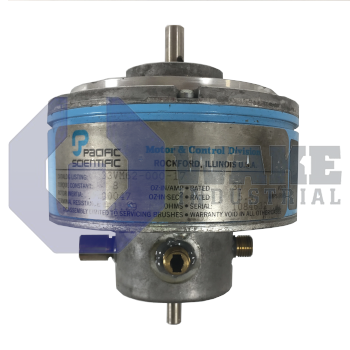 The 33VM62-000-17 PMDC servomotor features a rotor inertia of 3.3 x 10^-6 kg·m² and a continuous power dissipation of 54 W. Manufactured by Pacific Scientific as part of the Low Inertia PMDC Servomotors series, it operates with a rated voltage range of 18–36 V. This motor weighs 1.36 kg.