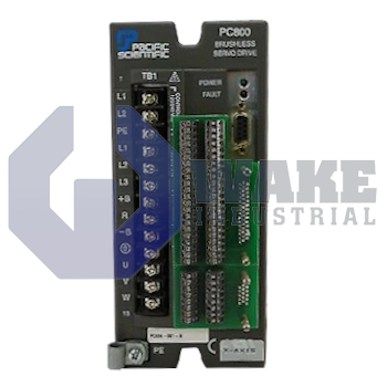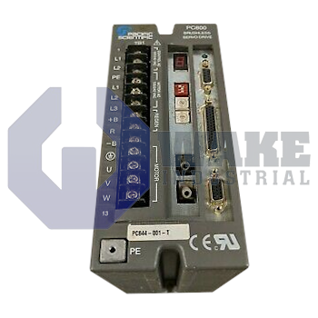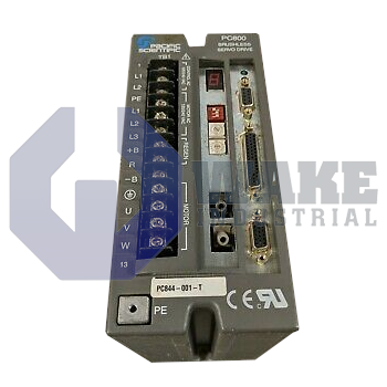 The PC844-001-F servo drive is an all-digital brushless model with a continuous output current of 7.1 A RMS at 25–40 °C, a peak output current of 21.2 A RMS, an input voltage range of 180–265 VAC, 3-phase, and a power stage efficiency of 98%. Designed as part of the PC800 - PCE800 Brushless Servo Drives by Pacific Scientific, it operates with an output current ripple frequency of 16 kHz.