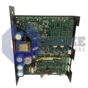 This SC403053T4 servo controller operates on a wide input voltage range of 115/230 V AC. It supports both single and three phase inputs at 50/60 Hz. The device tolerates input voltage fluctuations of + 10 % to – 15 %. It converts AC input into a nominal bus voltage of 160/320 VDC. The controller delivers a continuous output current of 7.5 A and a peak output of 15 A. A tachometer feedback gradient of 4.0 V/Krpm ensures accurate speed sensing. The controller’s J1 connector handles power input lines including 230 V, 115 V and ground. The J2 outputs motor power through R, S, T and ground terminals for three phase motor connections. The J3 and J4 provide interface connections for signal and control inputs. The controller includes LED indicators: green for POWER and red for FAULT that allows quick status checks. The adjustment points on the unit include VEL OFFSET, COMMAND GAIN, VEL LOOP GAIN and CURRENT LIMIT. This enables fine tuning of motor control parameters during setup or maintenance.