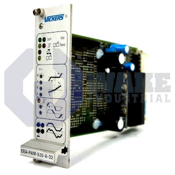 Power Amplifier Card Series for Proportional Control Valves manufactured by Vickers. This EEA-PAM-535-A-32 Card is For Proportional Valve KFD/TG4V-5 and has a Power Supply Nominal Voltage of 24V DC x 50W.