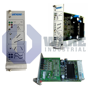 The Vickers EEA-PAM-561-B-31 amplifier card uses a 24V DC power supply with a 50W capacity. The card provides variable ramp times via front-panel potentiometers and external voltage signals.