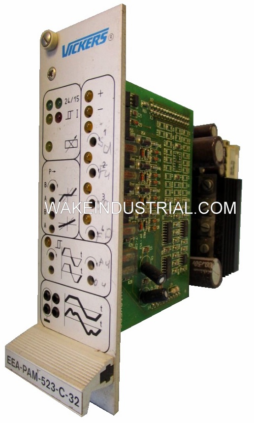 EEA-PAM-523-C-32 Power Amplifier Card Series manufactured by Vickers. This EEA-PAM-523-C-32 Card is For Proportional Valve K*G4V-3; KDG5V-5/7/8 and has a Power Supply Nominal Voltage of 24V DC x 50W.