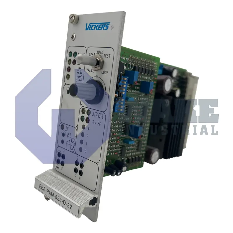 The Vickers EEA-PAM-553-D-32 power amplifier optimizes hydraulic control with ~10 V reference outputs and ~20 mA current input handling. It features configurable potentiometers for precise P-gain, I-gain, and D-gain adjustments.