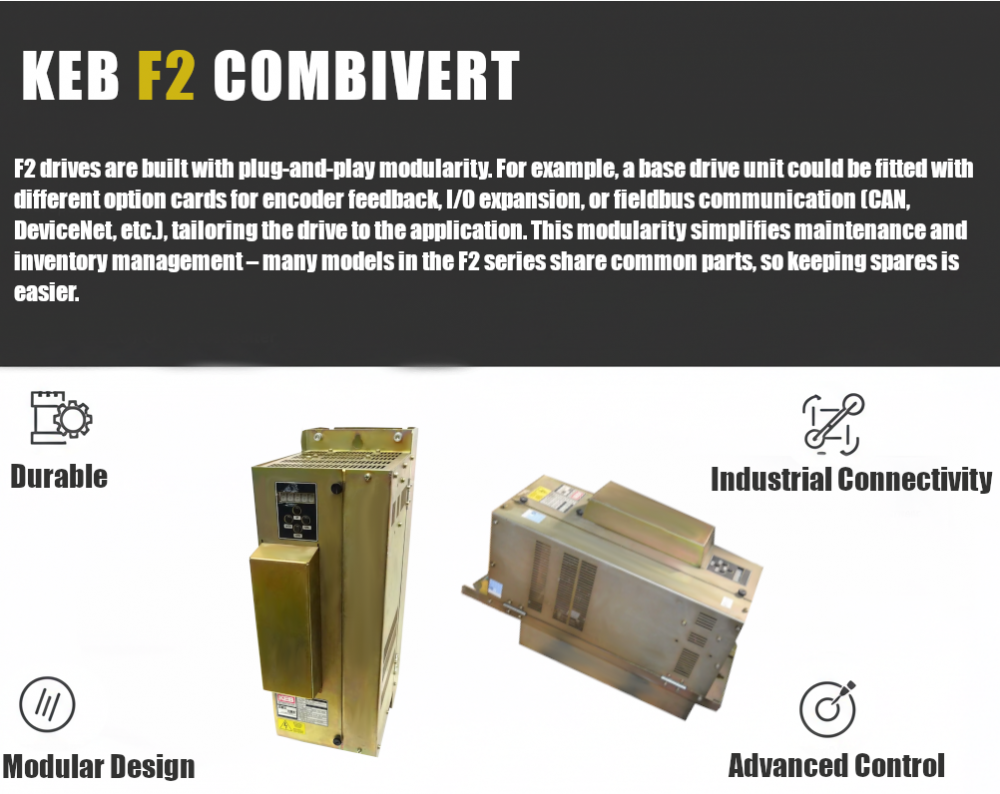 The KEB Combivert F2 series expanded on the capabilities of the F1 with a more comprehensive drive and control solution. Often described as a configurable “drive package,” the F2 series offered a modular approach: users could select from various inverter modules, power options, and even matching KEB motor packages to create an optimal system for their needs. This made the F2 extremely flexible across different power requirements and applications.
