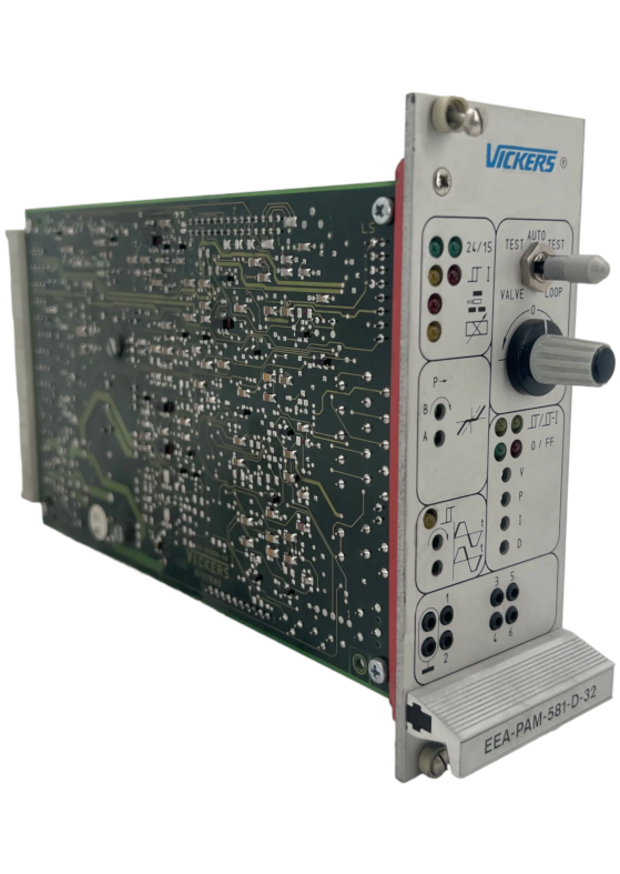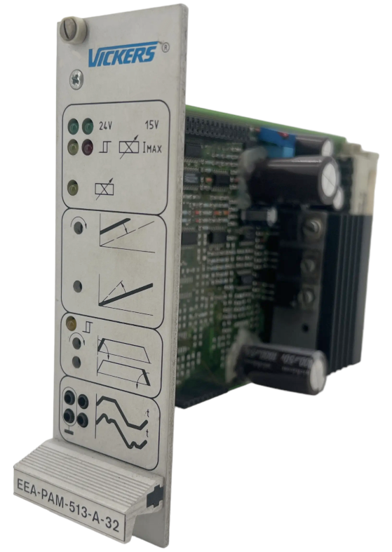 - EEA-PAM-525-A-32: A popular A-32 series card, the 525-A-32 is configured to work with Vickers KDG4V-5 proportional valves (H-coil type) and related models. It runs on a nominal 24 V DC supply at about 50 W capacity, providing ample power for larger solenoids. This unit features automatic shut-down below ~18 V and can drive up to 1.6 A, matching the requirements of many high-flow directional valves. The EEA-PAM-525-A-32 includes built-in automatic reset for overloads and dither control to improve valve hysteresis, ensuring smooth operation of the hydraulic actuator.
