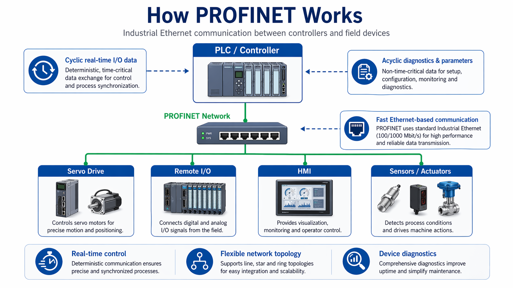 23 April, 2026 | PROFINET industrial protocol, PROFINET explained, how PROFINET works, PROFINET in industrial automation, Industrial Ethernet protocol, Bosch Rexroth PROFINET, PROFINET communication, PROFINET network architecture, PROFINET PLC communication, PROFINET servo drives, PROFINET remote I/O, PROFINET device diagnostics,